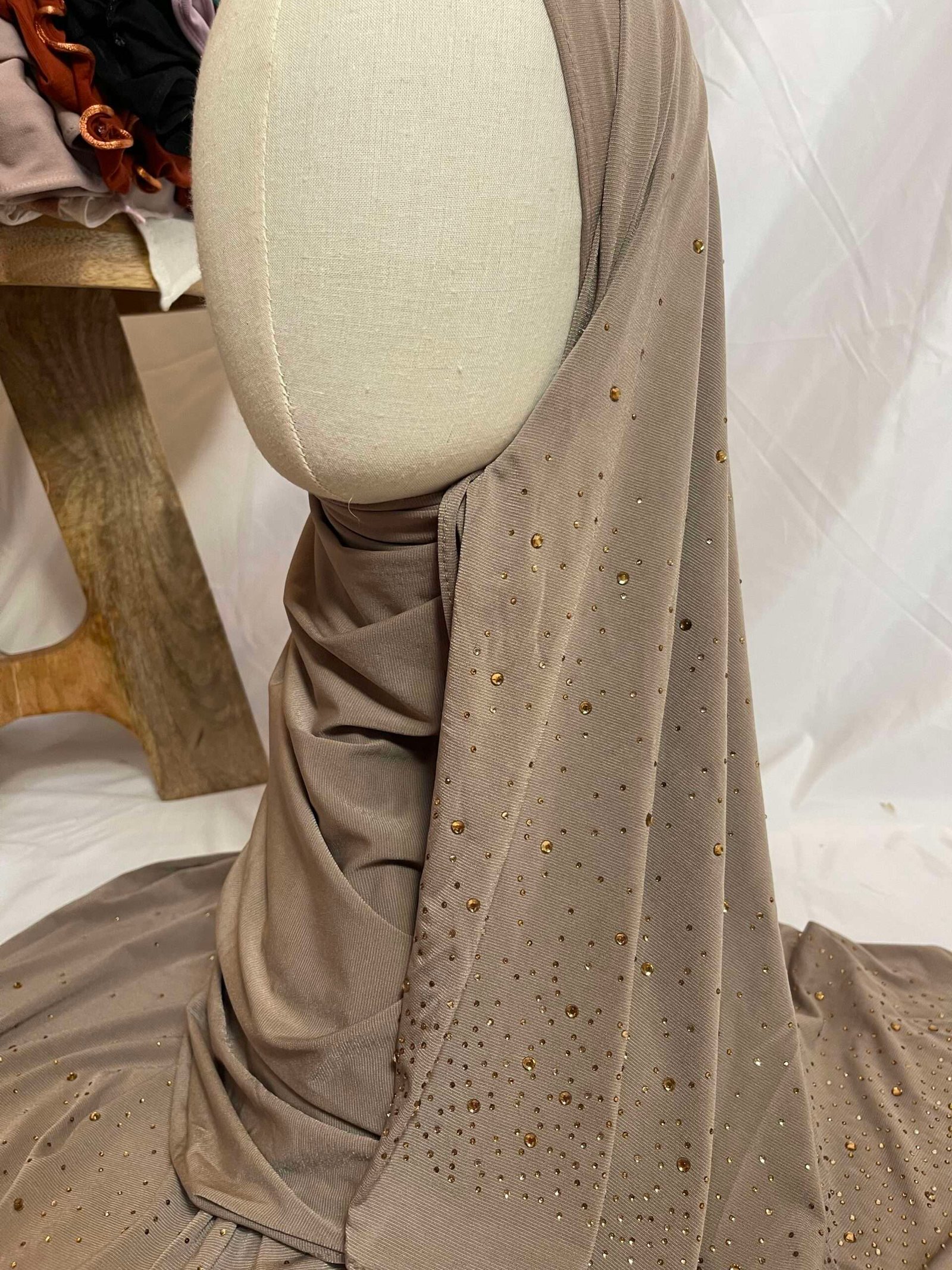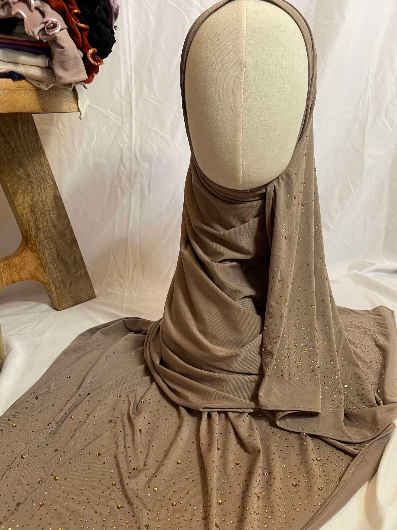 Laissez-vous séduire par l’élégance chaleureuse et le raffinement discret de ce superbe hijab taupe à effet ciel étoilé. Confectionné dans un jersey de haute qualité, il allie un confort exceptionnel à une pluie de strass dorés pour un look sophistiqué et lumineux.
