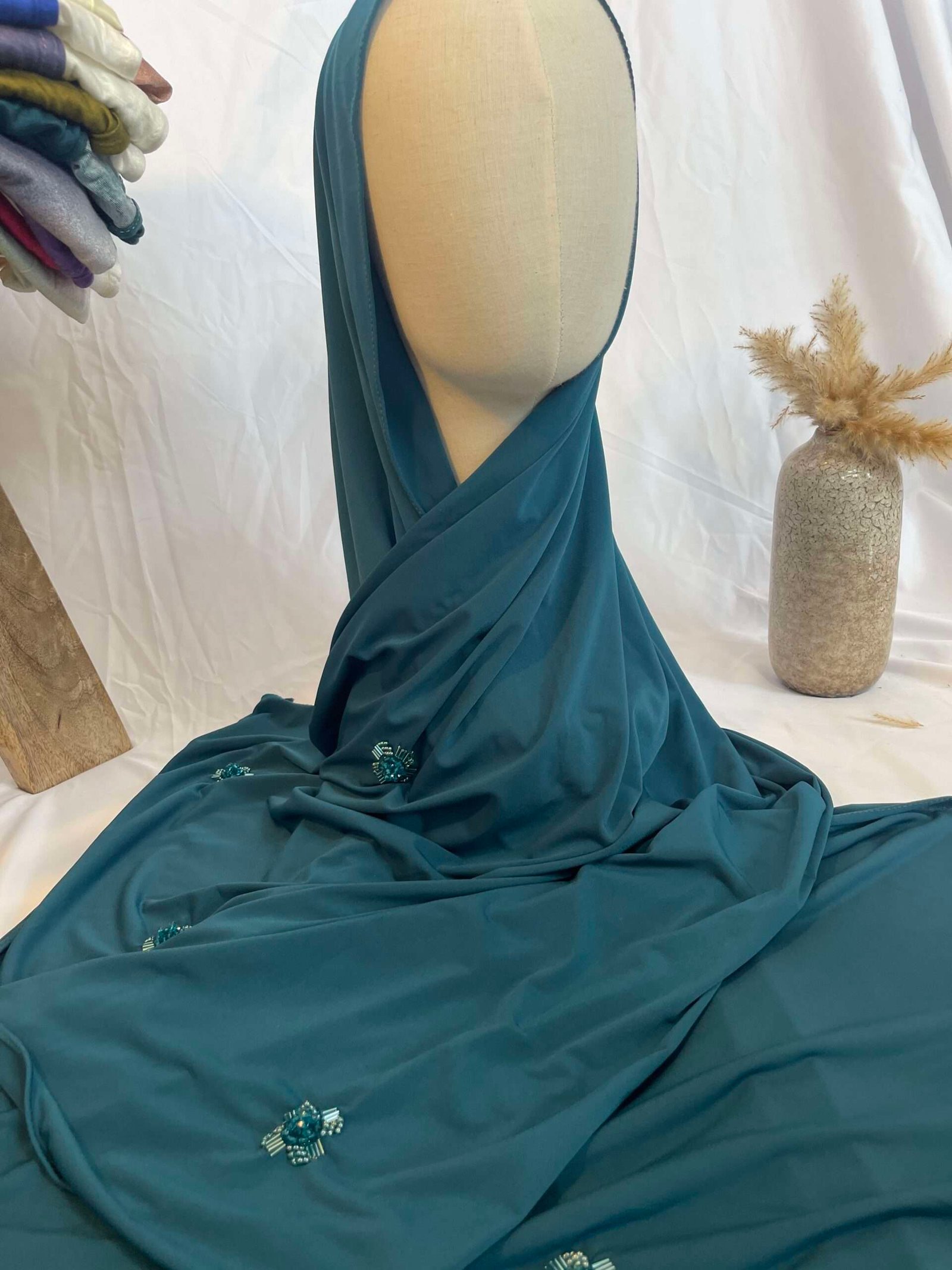 Ce hijab uni se distingue par sa couleur bleu canard profond, une teinte riche, intense et très tendance, qui peut rappeler un bleu pétrole ou un vert d’eau foncé. De somptueuses broches décoratives, composées de perles nacrées et de strass facettés dans des tons coordonnés de bleu/vert, sont artistiquement disposées sur le hijab. Elles captent la lumière et ajoutent une touche de préciosité et de raffinement unique.