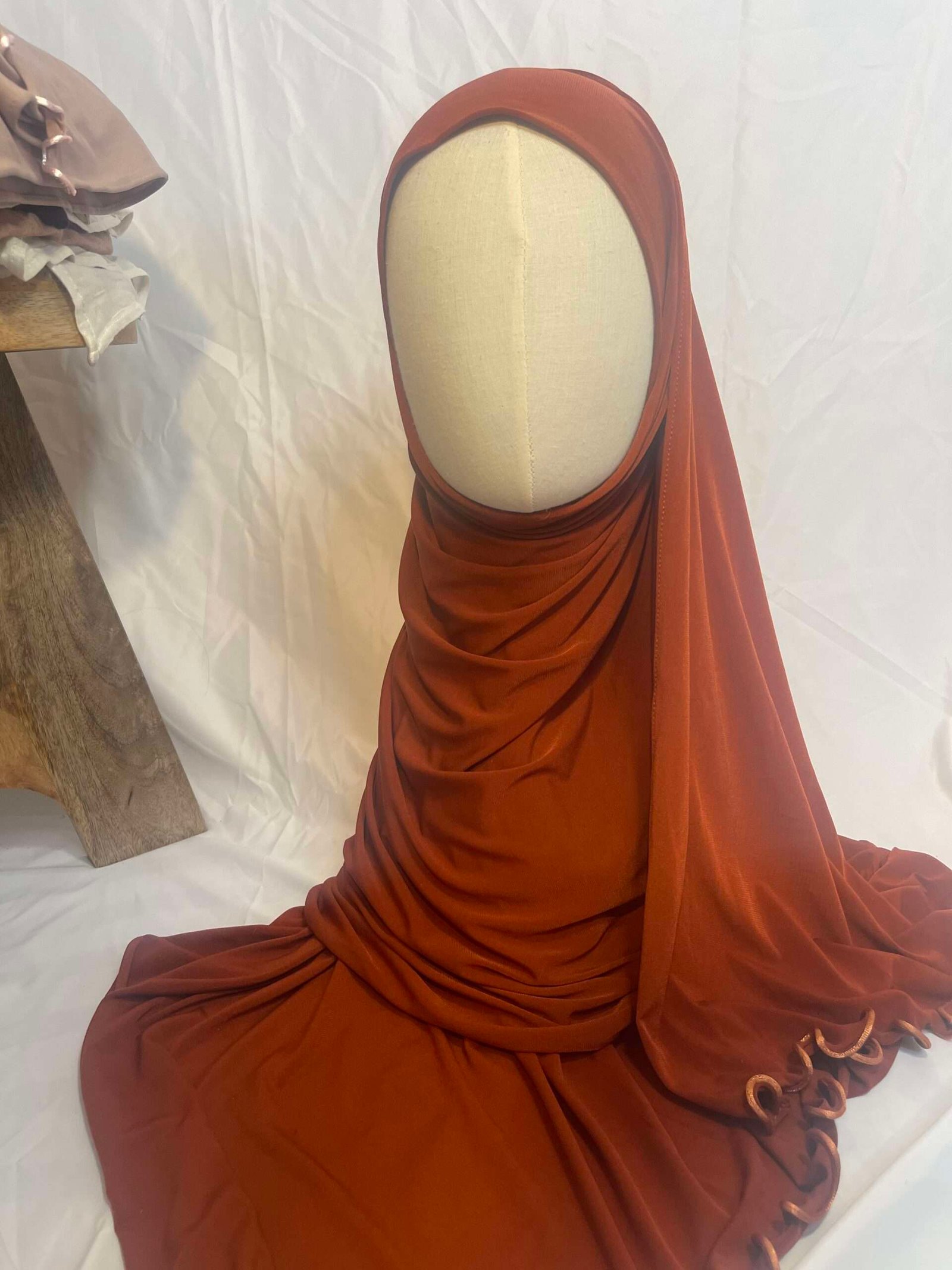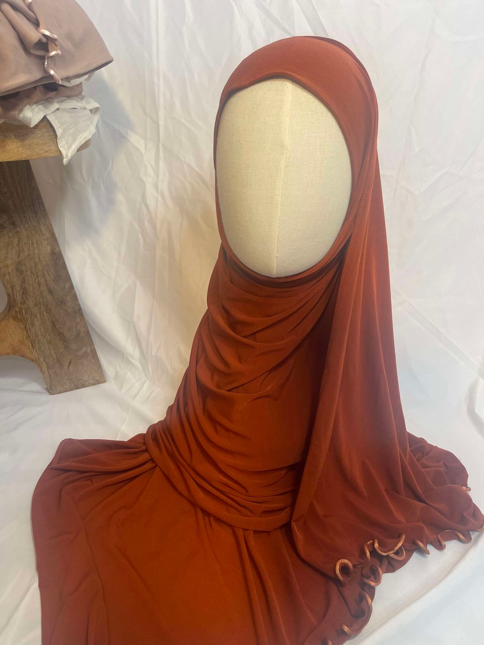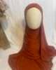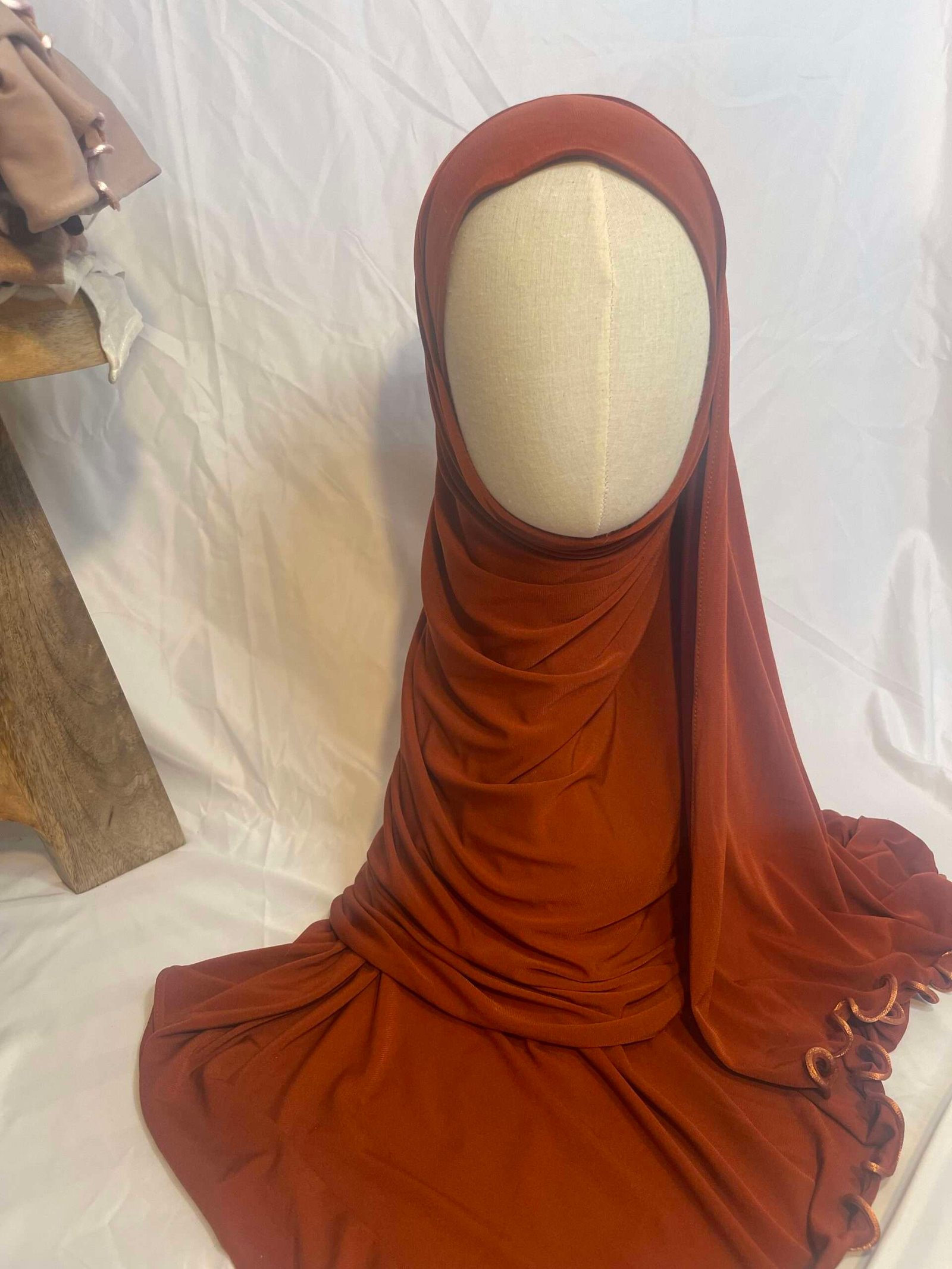 Ce hijab uni terracotta intense avec bordure festonnée est la pièce parfaite pour celles qui recherchent une élégance chaleureuse, une couleur tendance et un confort optimal.