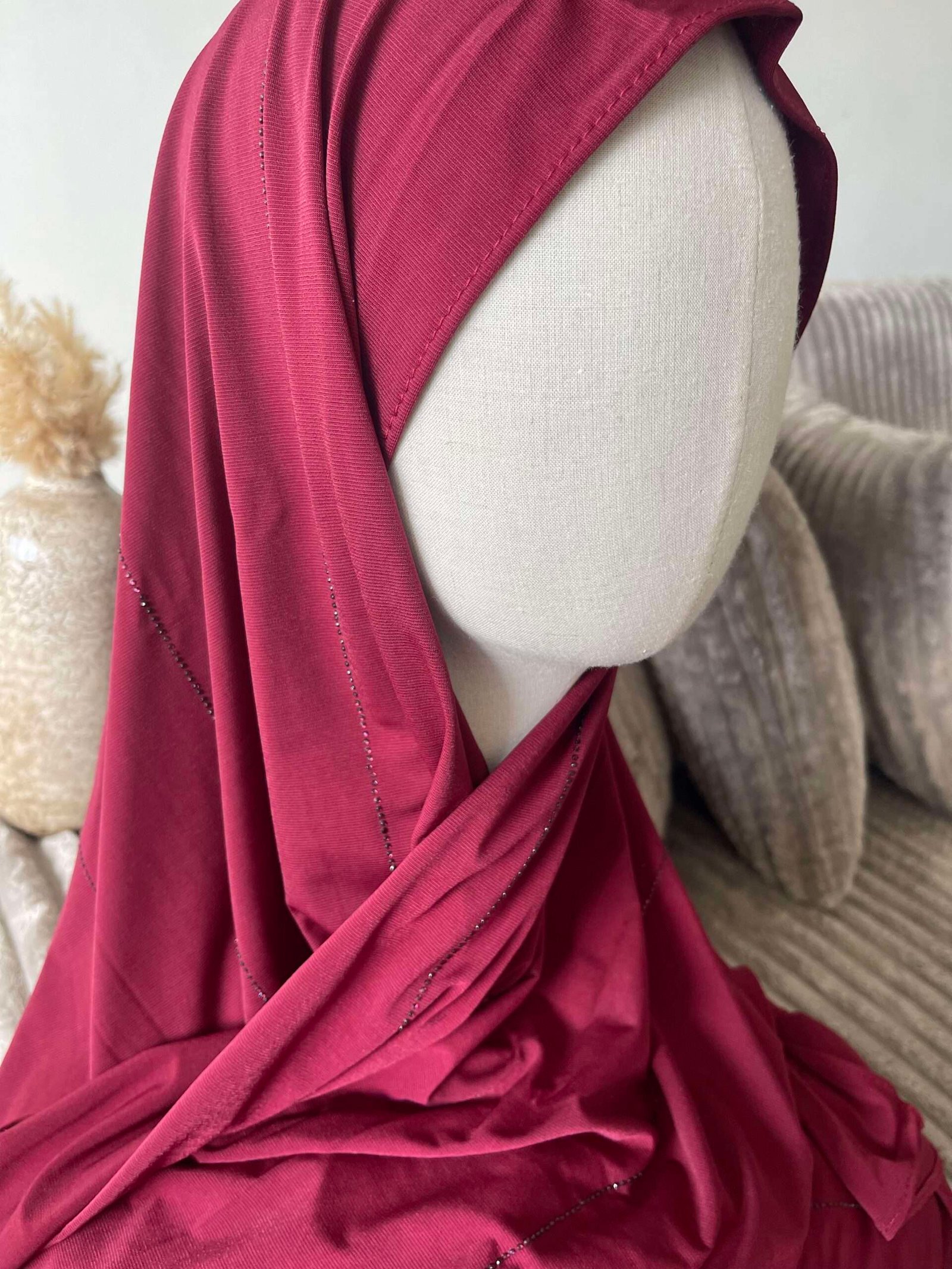 Ce hijab à strass rouge framboise est la pièce parfaite pour celles qui recherchent une touche de glamour, une couleur vibrante et un confort optimal.